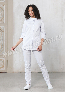 Современный женский костюм в спортивном стиле, состоит из блузки и брюк. Блузка средней длины полуприлегающего силуэта с коротким втачным рукавом и V-образным вырезом горловины. Полочка с отрезными кокетками и рельефами, выходящими из проймы, с вместительными накладными карманами в нижней части. Спинка с рельефными швами и эластичной кулиской, которая эффектно подчеркивает линию талии. Брюки-джоггеры на эластичном поясе с боковыми карманами и дополнительным карманом на правом бедре создают динамичный образ современного специалиста. Костюм выполнен из легкой эластичной ткани, в которой будет комфортно в течение всего дня, предназначен для медицинских работников и персонала СПА салонов.