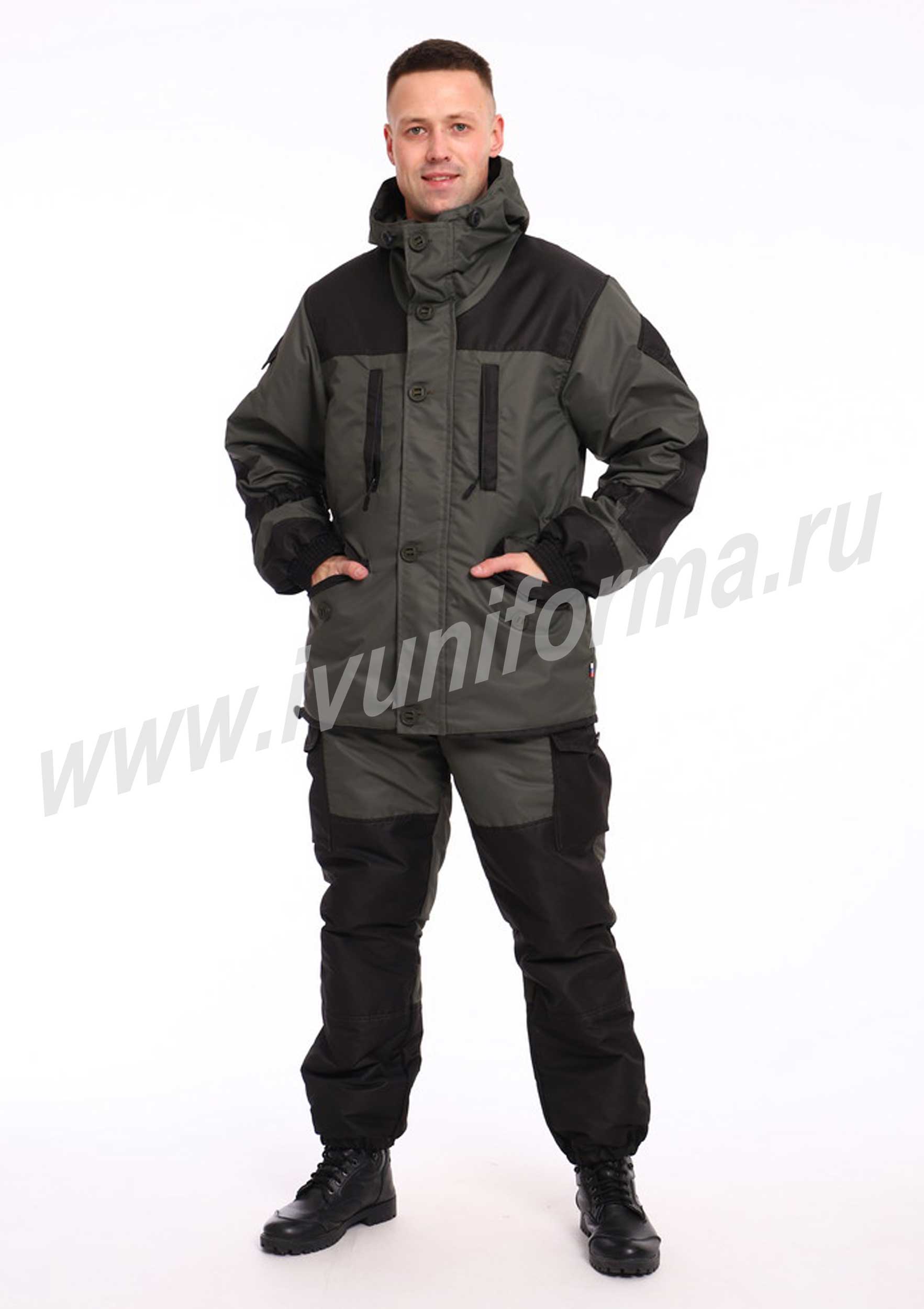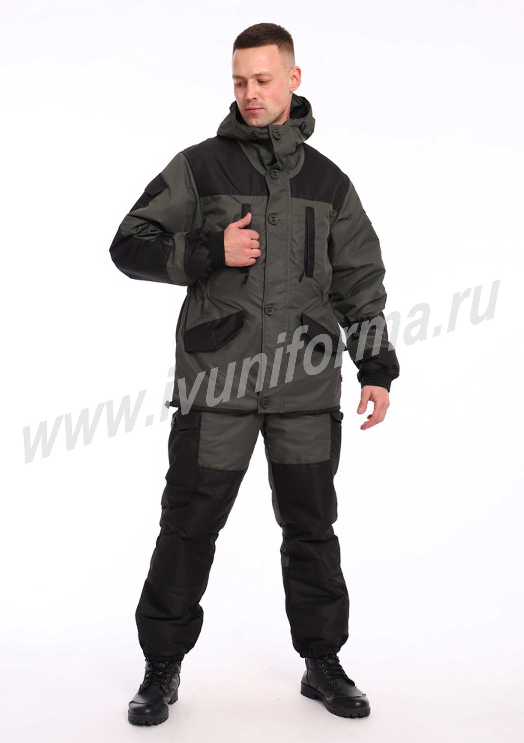 Костюм демисезонный мужской состоит из куртки и брюк. Разработан для охотников, рыболовов, для походов и активного отдыха. Куртка с застёжкой на молнию и капюшоном. Имеет два прорезных кармана на молнии и два прорезных кармана на пуговице. Так же предусмотрены два внутренних нагрудных кармана. Рукава с налокотниками и карманом с клапаном на липучке. Брюки на резинке по талии и низу, с усилением на коленях, имеют два объёмных кармана и два накладных кармана на пуговицах .