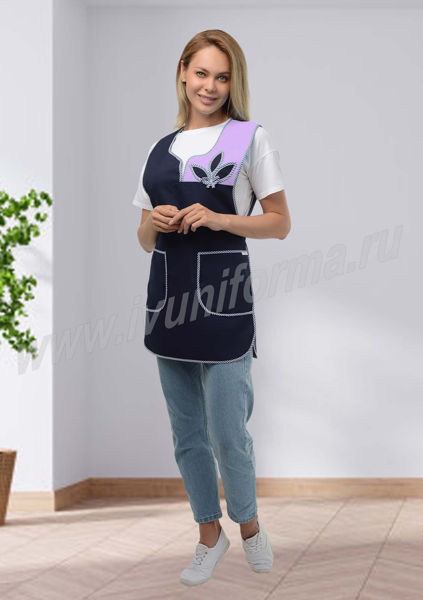 Фартук средней длины, перекидной, имеющий спинку без отделки и полочку с отрезными кокетками, одна из которых выполнена из материала контрастного цвета и декорирована отделкой в виде лепестков. В нижней части полочки расположены два вместительных кармана. Объем талии фартука регулируется завязками-поясами, все срезы фартука обработаны кантом из контрастной капроновой ткани. Фартук предназначен для защиты от общепроизводственных загрязнений.