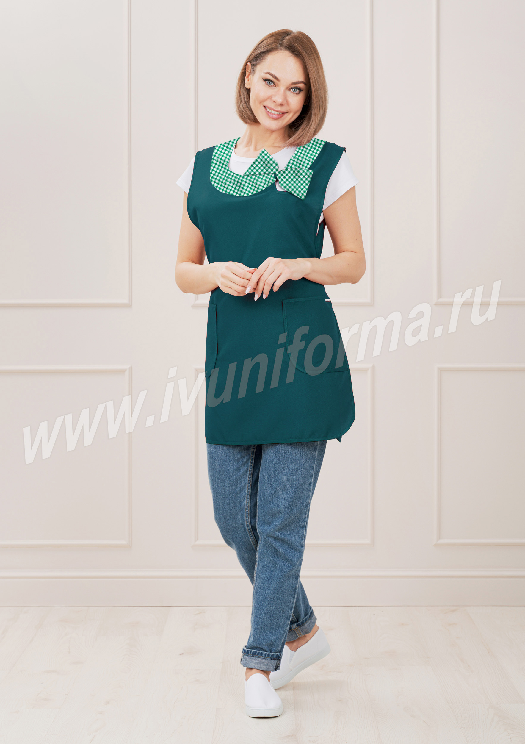 Фартук средней длины, перекидной. Спинка без отделки, полочка с круглым вырезом горловины и широкой обтачкой из отделочной ткани, имитирующей бант. В нижней части полочки расположены два вместительных боковых кармана. Объем фартука регулируется завязками-поясами, все срезы фартука обработаны износостойким кантом из смесовой ткани. Фартук предназначен для защиты от общепроизводственных загрязнений.