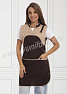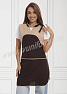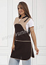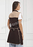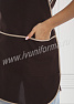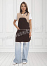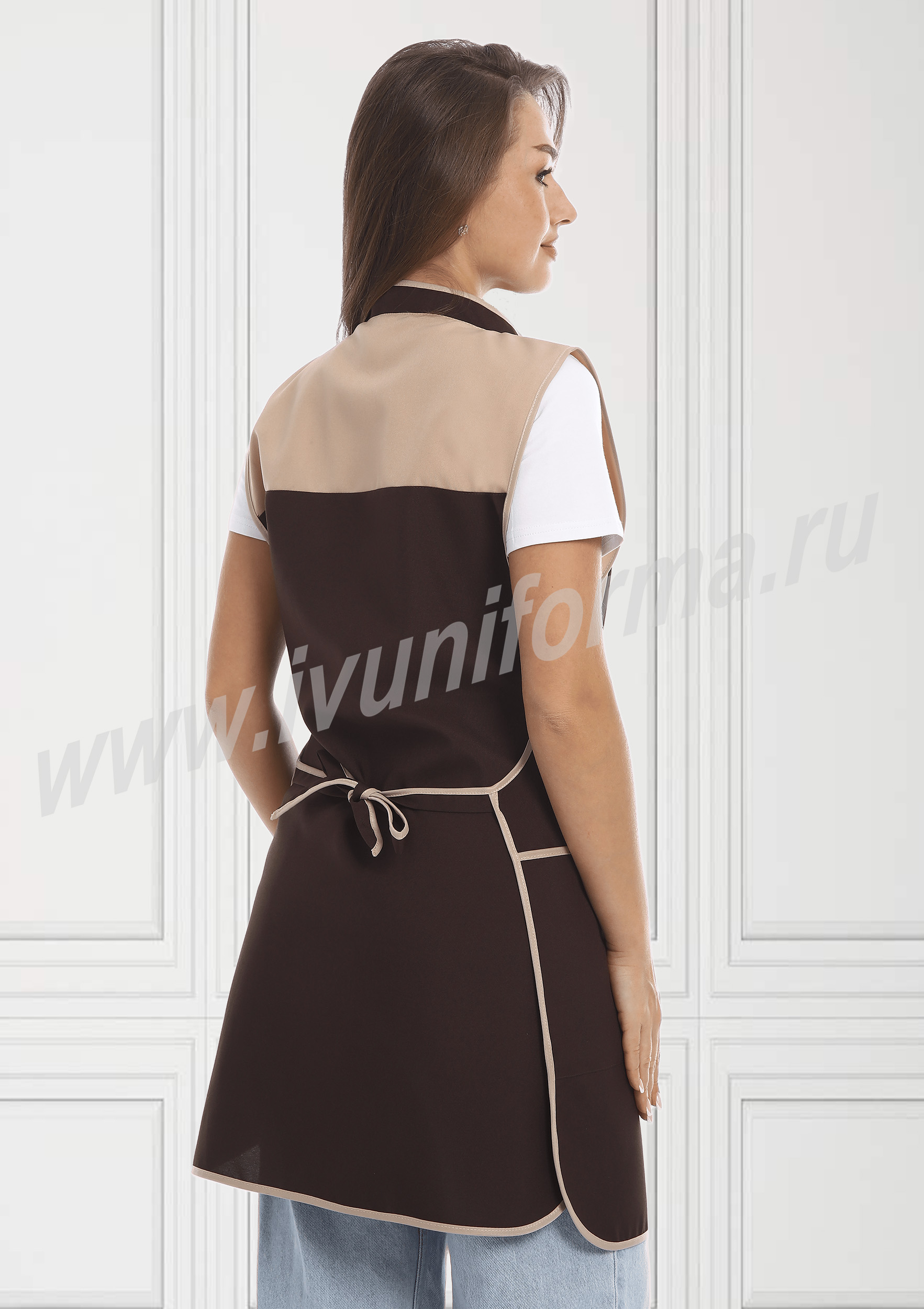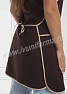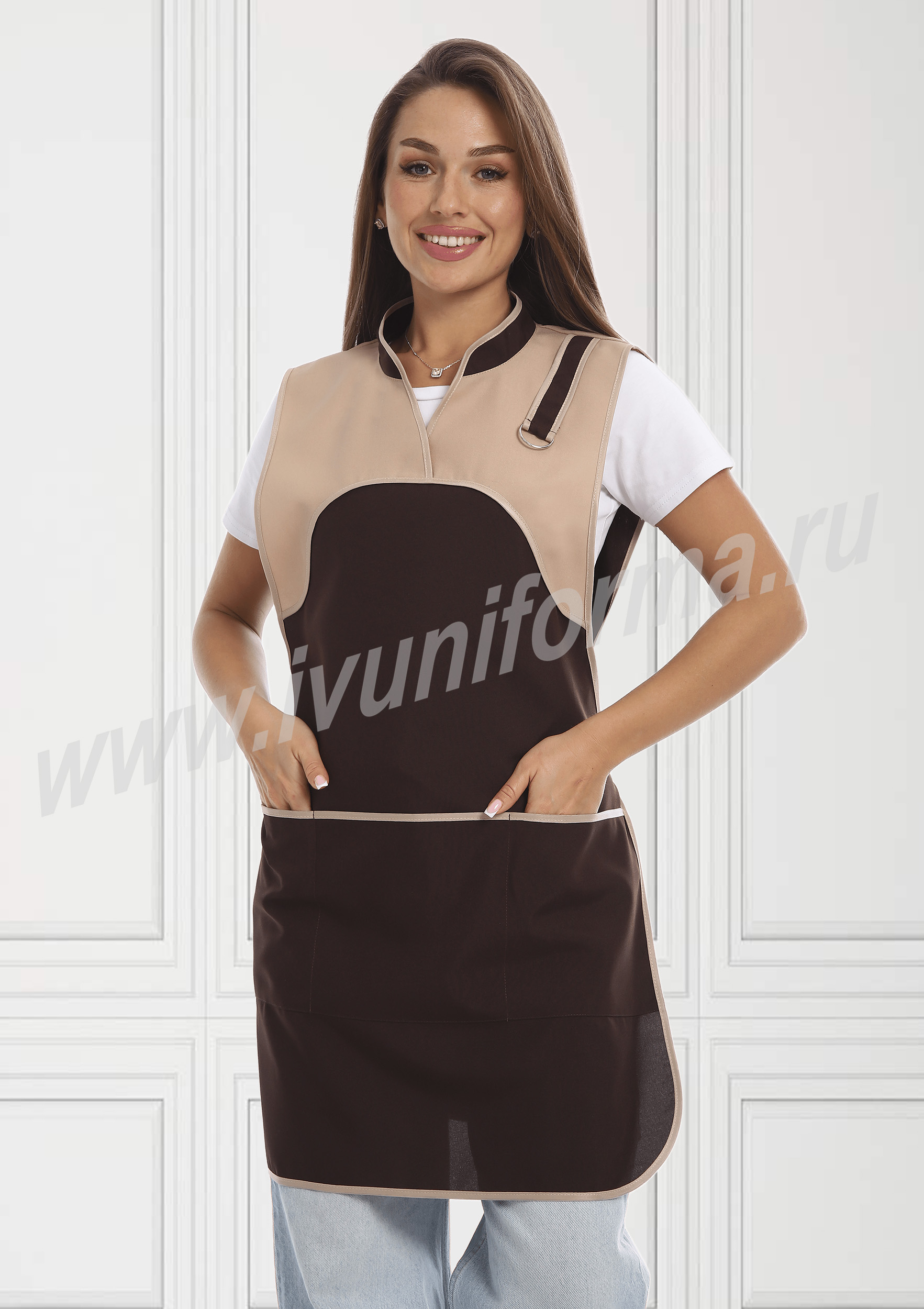 Фартук средней длины, перекидной, с V-образным вырезом горловины и воротником стойкой. Спинка с отрезной кокеткой из отделочного материала. Полочка с фигурными симметричными кокетками из отделочного материала и вместительным карманом с тремя отделениями в нижней части, на левой кокетке расположен держатель для бейджа. Ширина фартука регулируется завязками – полупоясами. Все срезы фартука обработаны кантом из контрастной капроновой ткани. Фартук предназначен для защиты от общих производственных загрязнений.