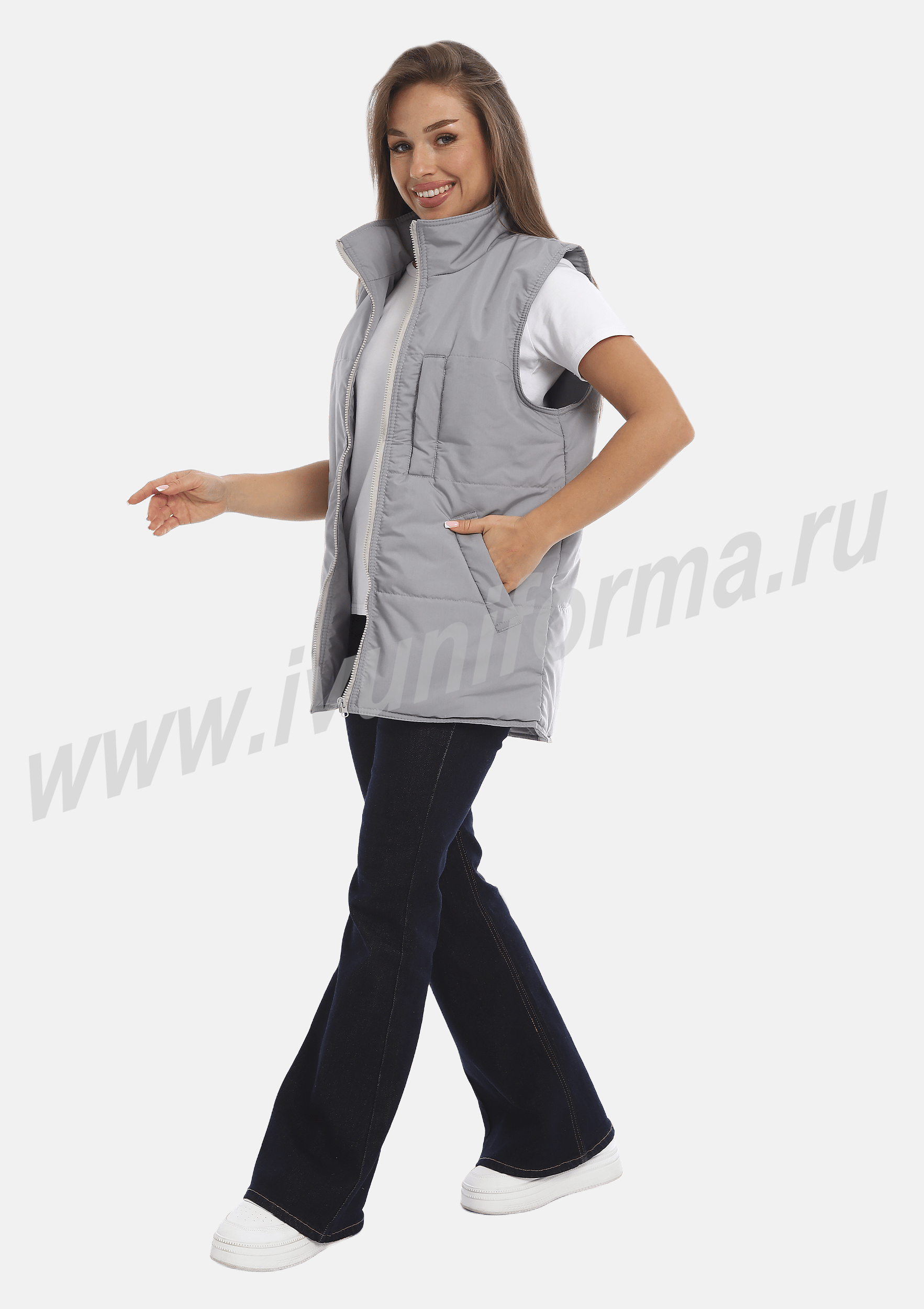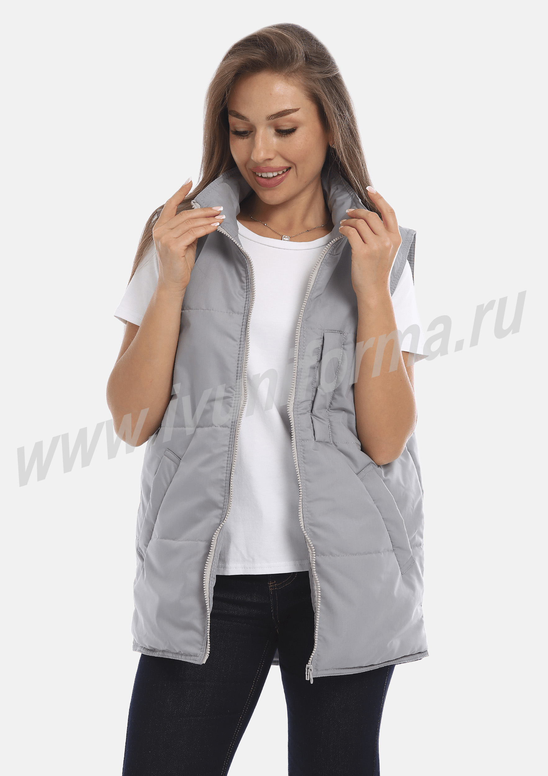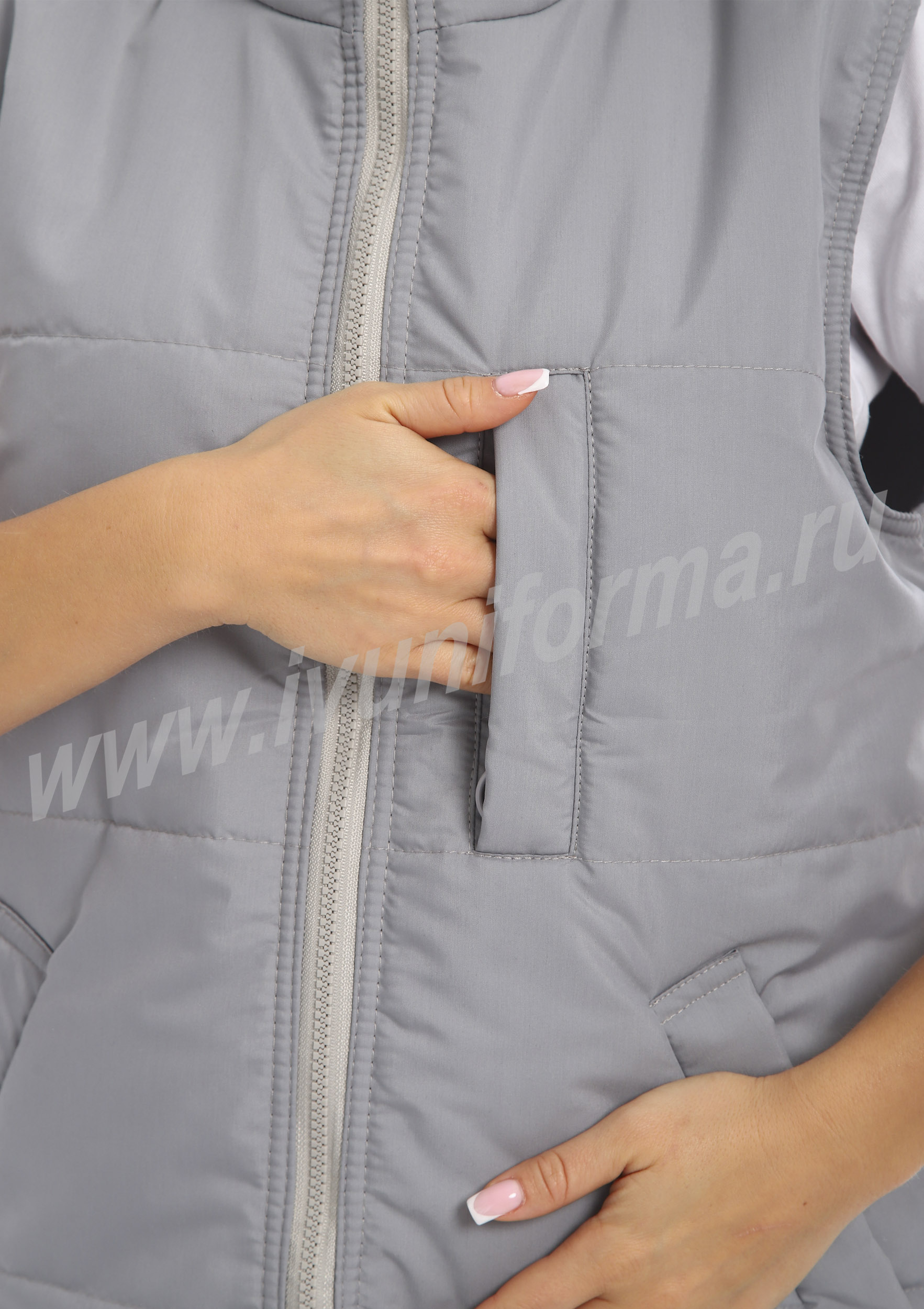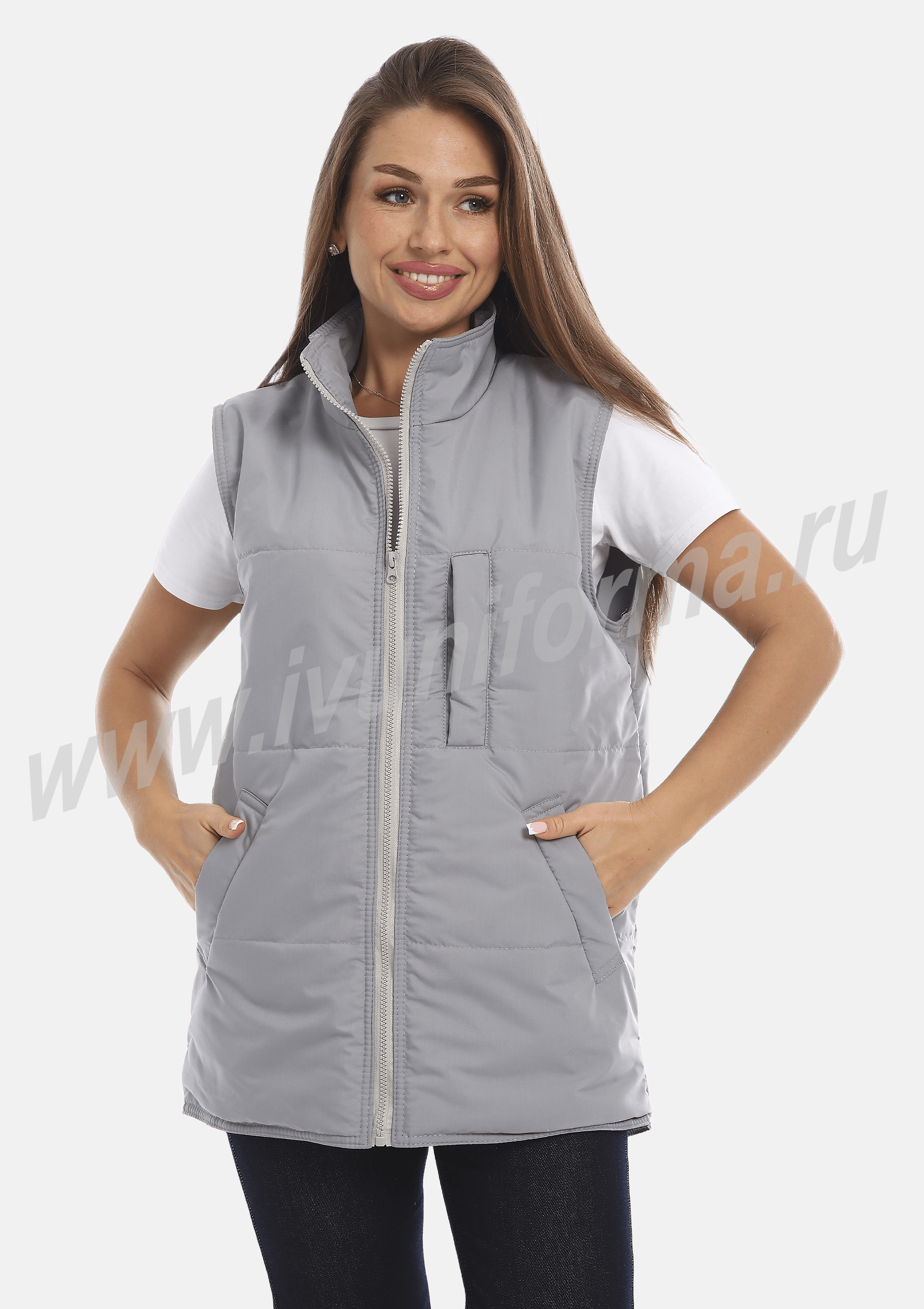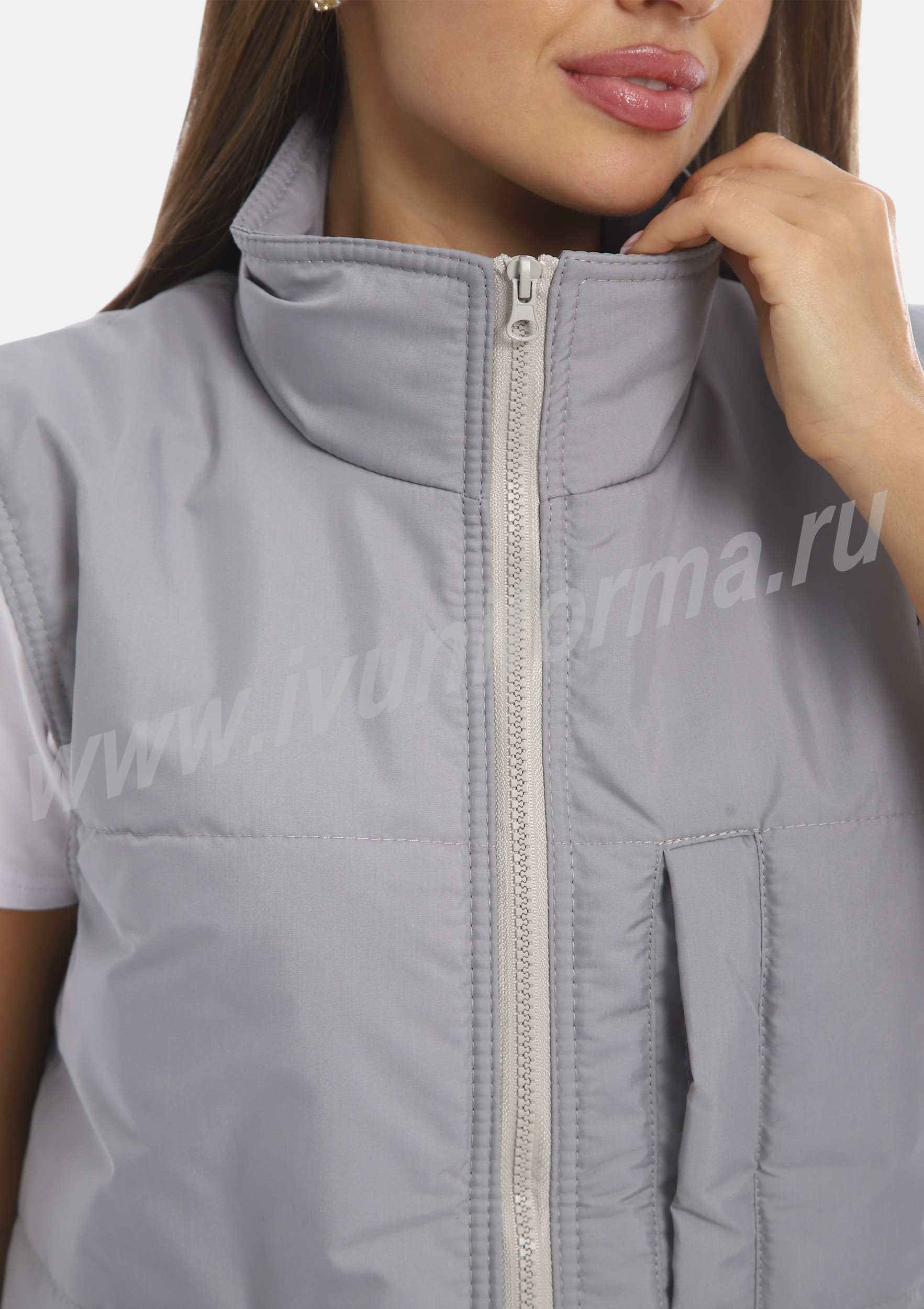 Жилет прямого силуэта, на молнии, с прорезным карманом на груди и двумя нижними карманами с листочкой в нижней части. Воротник выполнен в виде стойки, спинка удлиненная. Легкий и комфортный жилет предназначен для сотрудников сферы обслуживания и является унисекс.