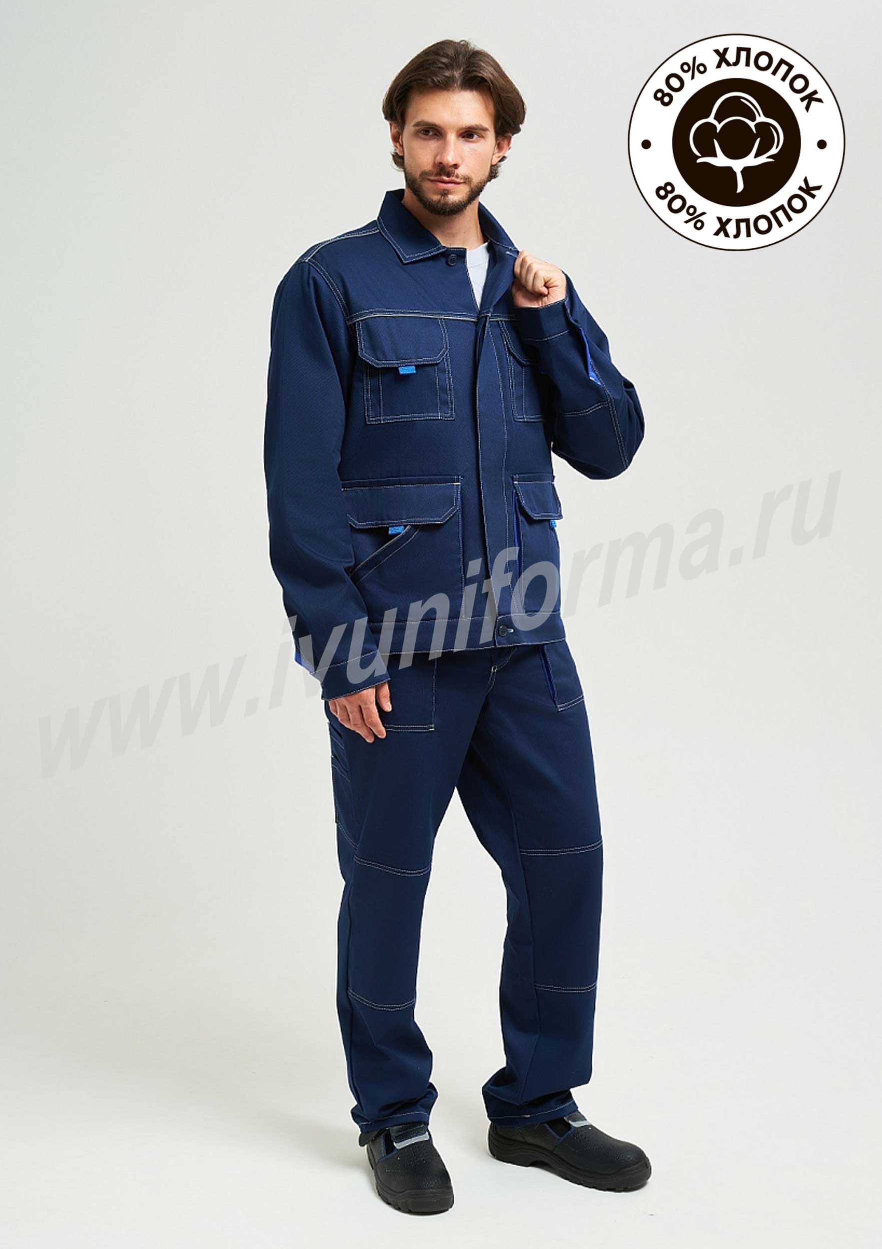 Костюм рабочий мужской состоит из куртки и брюк. Куртка прямого силуэта с отрезным поясом. Застежка центральная потайная (супат) на три обмётанные петли и пуговицы и две сквозные петли и пуговицы (в верхней - на кокетке и нижней - на поясе). Полочка с отрезной кокеткой, по шву которой проходит СОП-кант. Спущенная линия плеча, по шву которого также проложен СОП-кант. Рукав втачной двухшовный, со шлицей из отделочного материала. Локтевая часть с налокотником. Воротник стояче-отложной, по центру горловины - петля-вешалка. Низ куртки с притачным поясом, по бокам которого – паты, для регулировки ширины. Брюки прямые с отрезным поясом, застегивающимся на 1 обметанную петлю и пуговицу, с центральной застежкой-гульфик на молнии. На поясе 6 шлевок. Передние половинки брюк с наколенниками, с боковыми карманами с косым входом. На задней правой половинке брюк два кармана для инструмента. По бокам пояса брюк, для регулировки ширины по талии, имеются паты. Костюм отстрочен отделочными нитками. Костюм рабочий мужской с СОП предназначен для защиты от общепроизводственных загрязнений и производственных травм.