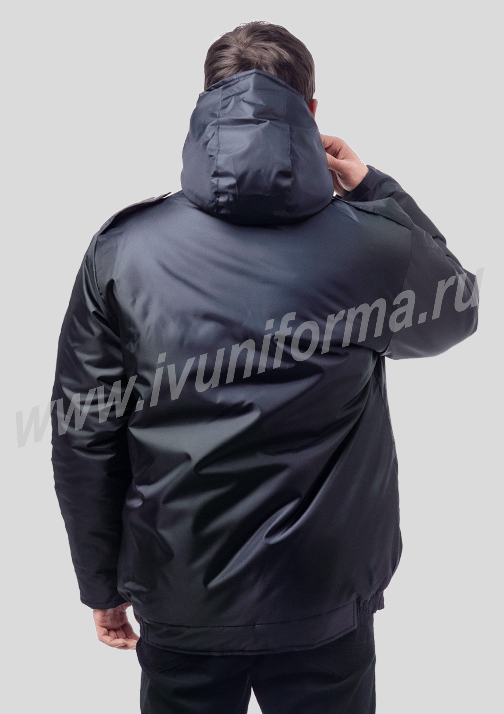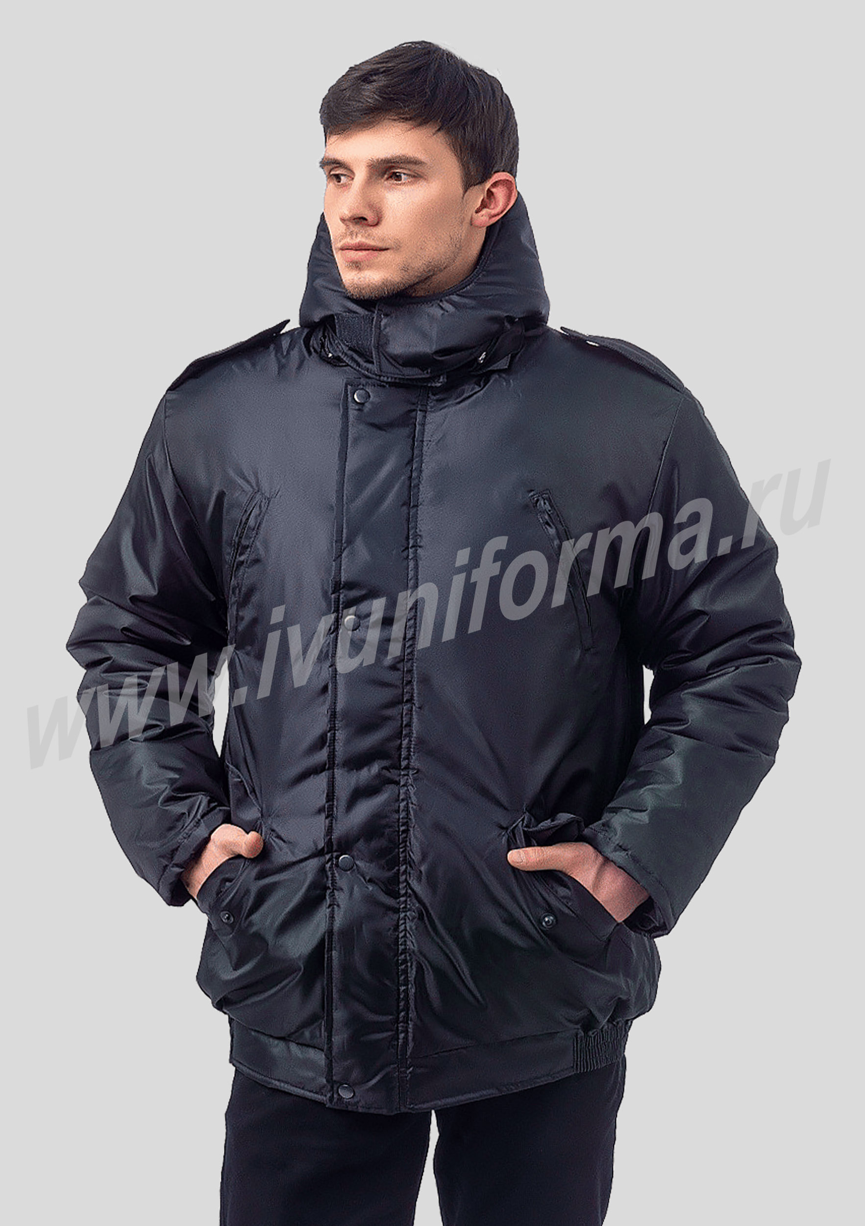 Куртка рабочая мужская для охранника, укороченная, с капюшоном на разъемной молнии, закрытой ветрозащитной планкой на кнопках. На полочках два нагрудных прорезных кармана на молнии, нижние карманы прорезные. Воротник – стойка, внутри на флисе. Капюшон съемный с застёжкой на контактную ленту Velcro. Куртка предназначена как для повседневной носки на предприятиях, так и для сотрудников охранных структур.
